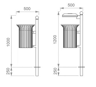 Cestino stradale sagomato a basso impatto ambientale, privo di qualsiasi prodotto nocivo e/o tossico, costituito da un cesto di Ø 400 mm e profondità 550 mm, realizzato con anello superiore in tondino di acciaio Ø 20 mm saldato a piatti verticali in acciaio piatto 25 mm spessore 3 mm. All’interno è alloggiato un cesto in lamiera di acciaio spessore 1,2 mm della capacità di 35 litri, fissato mediante viti alla base. Il cestino è completo di staffe per il serraggio fisso al palo. Il coperchio, dotato di sagomatura di rinforzo in lamiera di acciaio spessore 2 mm, è apribile per facilitare l’introduzione e l’estrazione delle buste; include posacenere in acciaio inox a svuotamento automatico all’apertura del coperchio. Il palo è realizzato in acciaio Ø 76 mm spessore 3 mm, completo di tappo finale piatto in acciaio.