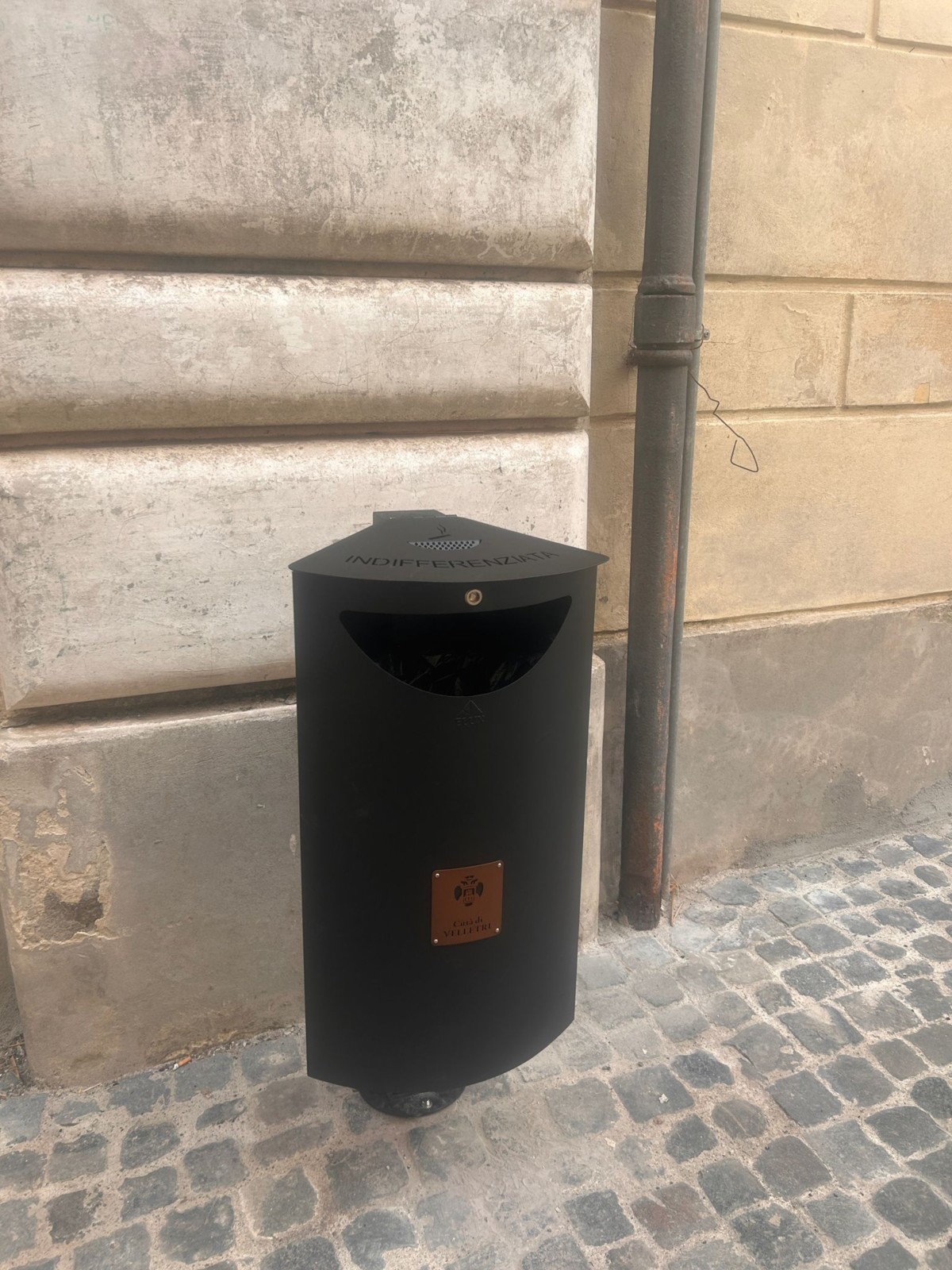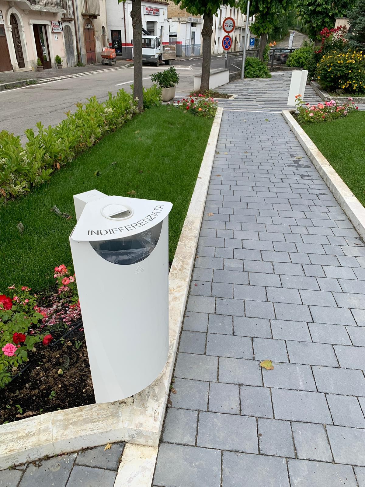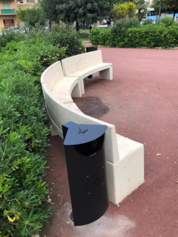 Cestino stradale a basso impatto ambientale, privo di qualsiasi prodotto nocivo e/o tossico, composto da quattro bocche in acciaio della capacità totale di 160 litri.