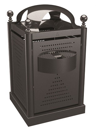 Personalizzabile per adattarsi a qualunque esigenza di arredo urbano, questo cestino è disponibile con coperchio e posacenere, e può essere posizionato a manufatto libero tramite base in CLS.