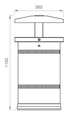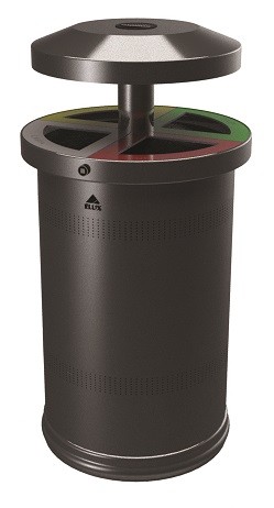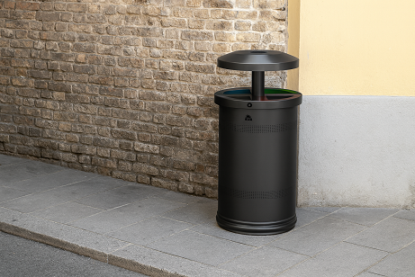 Cestino in acciaio zincato a caldo UNI EN 10327 - 10143 di spessore 1,5mm, Ø 500mm, altezza 840mm, capacità 90 litri. Coperchio apribile con un’apposita serratura di apertura con mappatura standard quadra, dotato di apposite bocche con colorazioni diverse e relative scritte sagomate al laser per identificare il rifiuto.