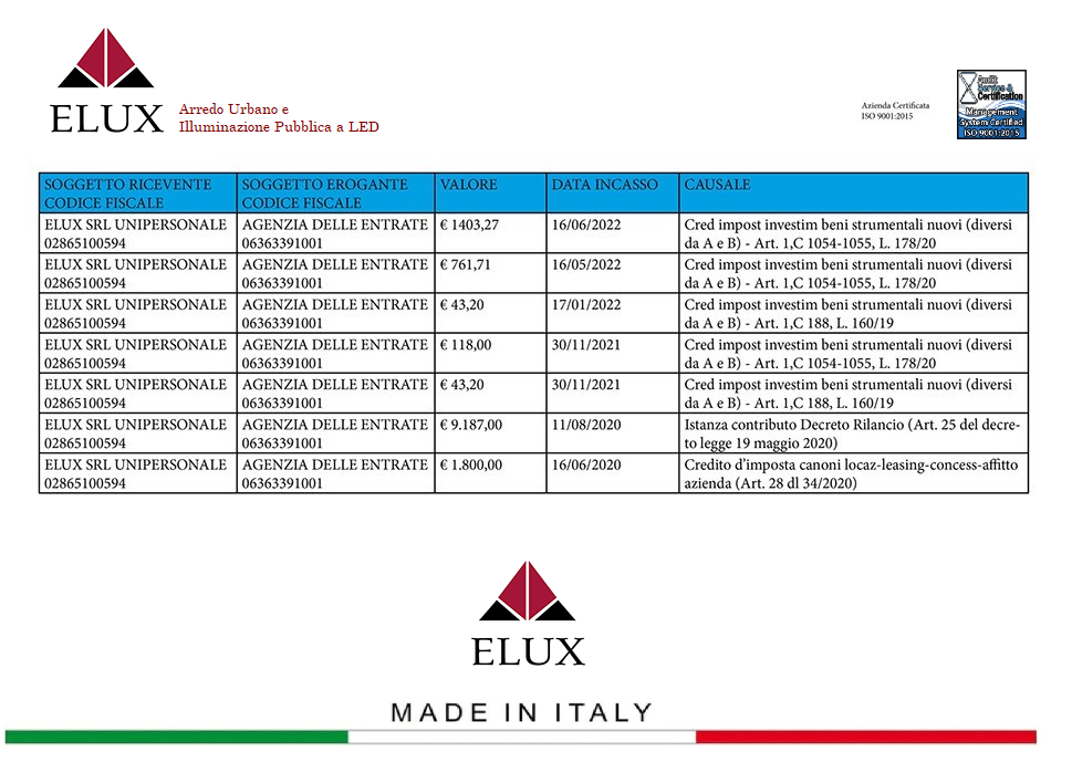 Gli aiuti di Stato e gli aiuti de minimis ricevuti dalla nostra impresa sono contenuti nel Registro Nazionale degli aiuti di Stato di cui all'art. 52 della L. 234/2012 e consultabili al seguente link, inserendo come chiave di ricerca nel campo "CODICE FISCALE" il codice fiscale dell'azienda.